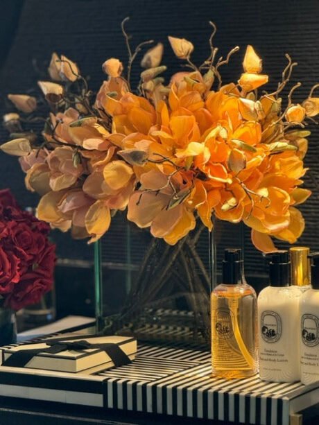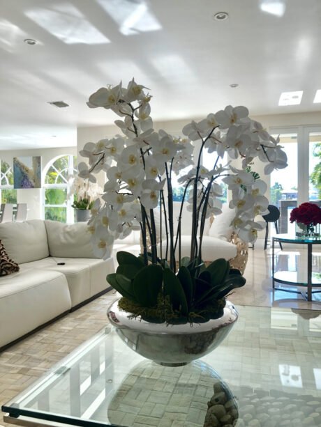 36″ Casa Moderna Black Tinted Glass Plate Planter with white Phalaenopsis orchids
