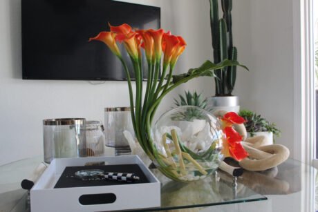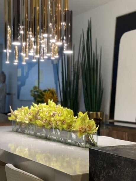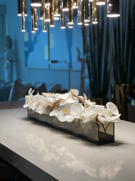 48″ Casa Moderna glass plate planter with green Cymbidium orchids