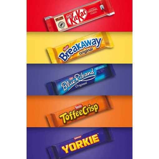 A display-ready presentation box featuring five delicious chocolate biscuits + Includes an assortment of KITKAT. BREAKAWAY. BLUE RIBAND. TOFFEE CRISP and YORKIE BISCUIT chocolate biscuit bars + Suitable for use at any catering or office event + Free from artificial colours. flavours. preservatives or hydrogenated fats and Suitable for vegetarians.