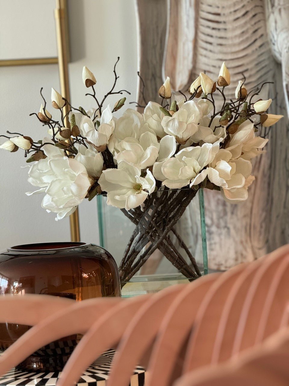 Square Casa Moderna glass planter with multiple stems of peach OR white magnolia blossoms. foliage and sand blasted grape wood anchored in our illusion water. Enjoy beautiful. lifelike magnolia tree branches that won’t fade after spring awakens. Displayed here in a stylish clear glass planter. magnolia flowers are cheerful and elegant in any season. Each hand-placed blossom and leaf is crafted with vivid color and exceptional detail. a tribute to Mother Nature’s artistry. Showcase this lovely faux tree on your dining table or living room tabletop.